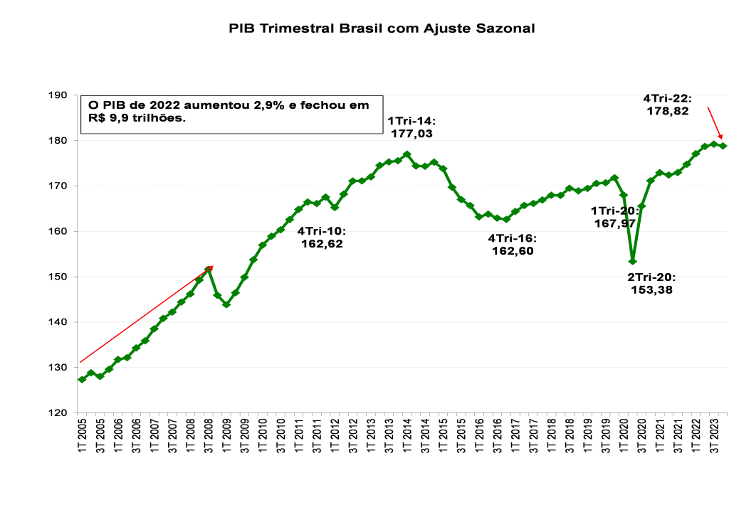 O PIB vinha crescendo de forma sustentada, mas, em fins de 2019, ainda estava 3% abaixo do pico do primeiro trimestre de 2014. No final do primeiro semestre de 2020, o PIB tinha despencado quase 11%, comparado a fins de 2019. Do fundo do poço, o PIB teve uma recuperação bastante sustentada, mas, no último trimestre de 2022, caiu 0,22% em relação ao trimestre anterior.