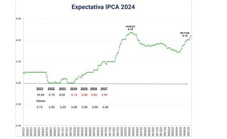 No caso da inflação, o BC tem tido bastante sucesso, considerando que nos últimos 12 meses até junho de 2024 a inflação ficou em 4,23%, despencando de 12,13% nos 12 meses, até abril de 2022. Cautelosamente, o BC começou a reduzir a taxa Selic um ano atrás, em 2 de agosto de 2023, de 13,75% ao ano para 13,25%, no primeiro movimento.