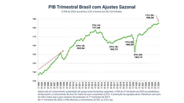 Há coisas boas a reportar no primeiro semestre de 2024. Em relação à economia mundial, apesar de guerras e tensões em algumas regiões do mundo, destacamos que o desempenho se mostrou bastante resiliente e a última projeção de crescimento do Fundo Monetário Internacional (FMI), de julho de 2024, é de expansão de 3,2% no ano, com expansão de 2,7% da maior economia do mundo (Estados Unidos).