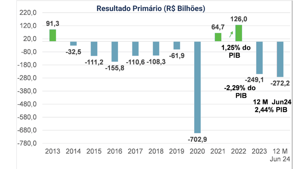 Esperamos que haja um pouco de pragmatismo para não piorar demais as contas fiscais, que já estão muito frágeis. Confira o desempenho ao longo dos anos do resultado primário do setor público (todas as receitas menos as despesas não relacionadas a juros do estoque de dívida). Assim como em uma empresa ou família, quem tem dívidas deve guardar uma parte da renda para pagar pelo menos os juros dessa dívida.