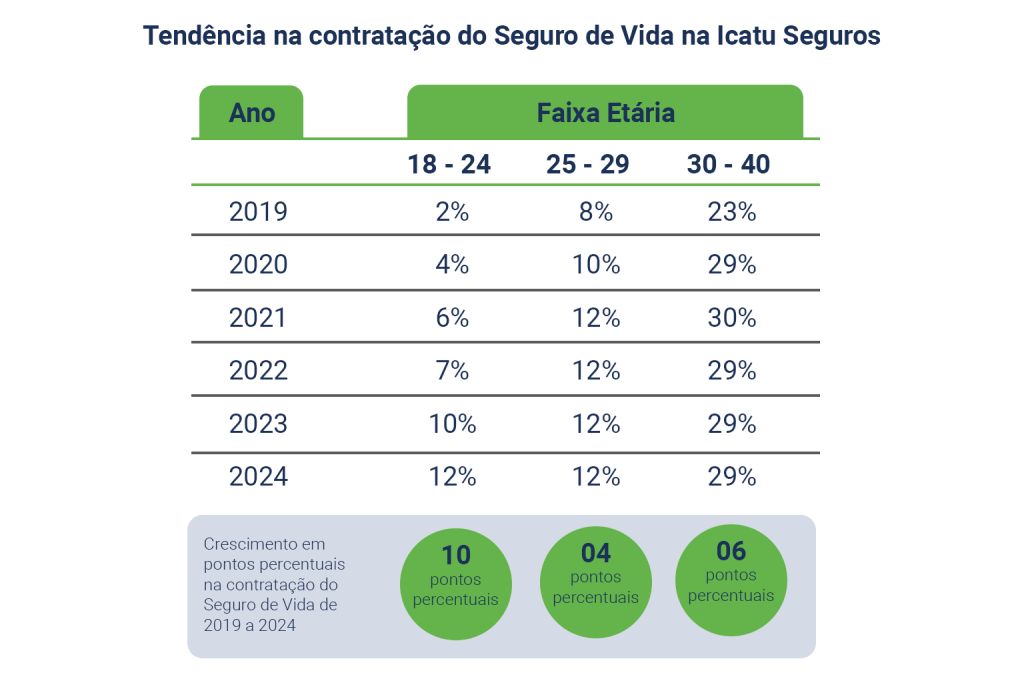 A Icatu Seguros, a maior seguradora independente do país, também tem observado tendências significativas na contratação do seguro de vida. A faixa etária de 18 a 24 anos tem mostrado um crescimento contínuo em pontos percentuais desde 2019. Se destacando como um grupo cada vez mais consciente sobre a importância de garantir uma proteção financeira para o futuro e o presente. Conforme a tabela abaixo ilustra: